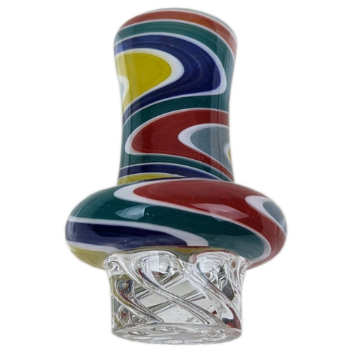 The 30mm Assorted Reversal Cyclone Carb Cap is a dabbing accessory made to create a swirling airflow pattern inside a compatible banger. The "reversal" aspect refers to the colored glass design, which creates unique visual effects. This carb cap is designed with angled air paths that force incoming air to spin in a cyclone or vortex pattern when placed over the banger. It has an outer diameter of approximately 30mm and is designed to fit flat-top quartz bangers of a similar size, ensuring a proper seal for optimal performance. The carb cap is typically made from durable, heat-resistant borosilicate glass.